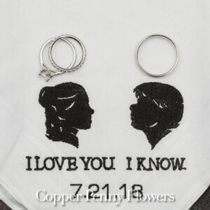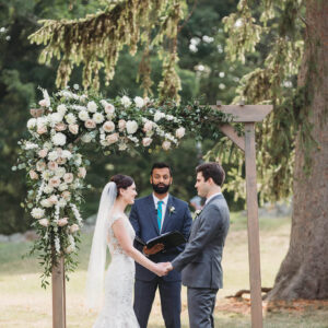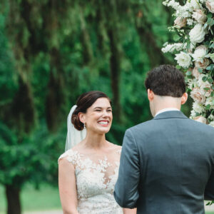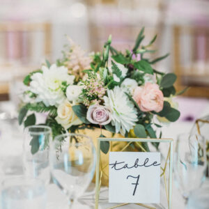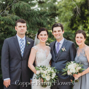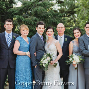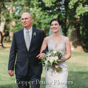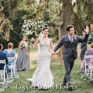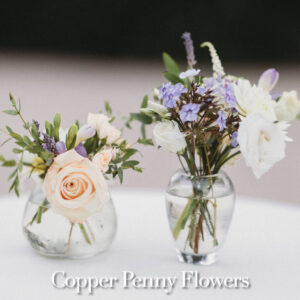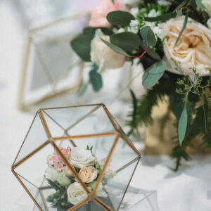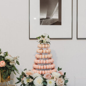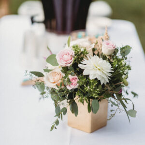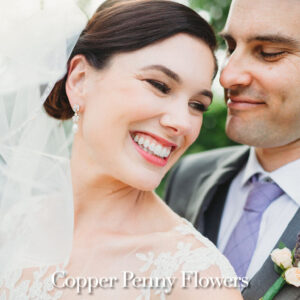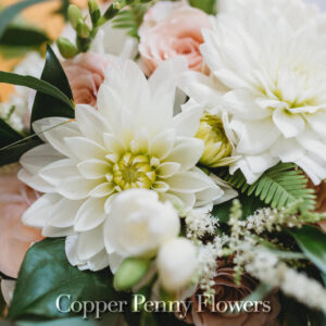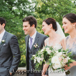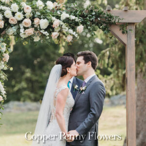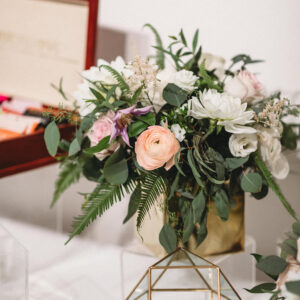 elegance plus romance with garden roses, lisianthus, and feathery astilbe. Centerpieces echoing the bride’s bouquet filled gilded cubes with companion miniature floral creations in gold-trimmed terrariums. Our Boston bride found her heart with her San Francisco groom—so Boston Tea Party and Golden Gate Bridge drinks celebrated this union of east coast and west coast. To crown this love-filled day? A peach macaroon tower set on a luxurious wreath of dahlias and roses. Thank you for making Copper Penny Flower’s artistry part of your masterpiece wedding…