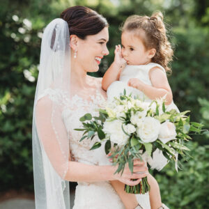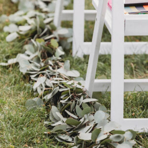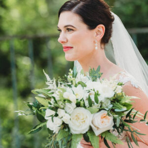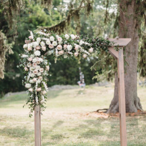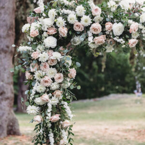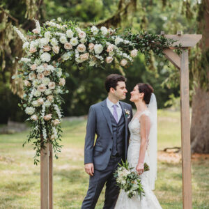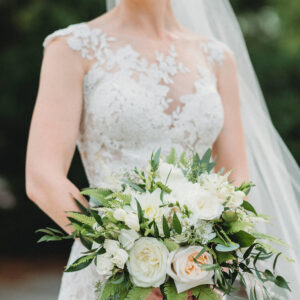 transformed the arbor with an abundance of dahlias and peach and white roses framed by eucalyptus and graceful Italian ruscus. Companion garlands framed the aisle. We created a bridal bouquet that was