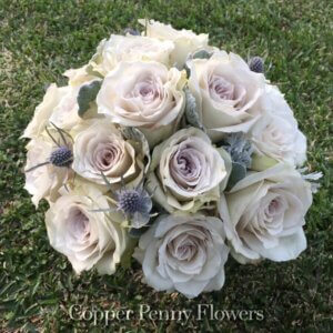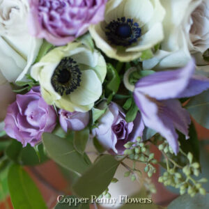 On trend roses popular at Copper Penny Flowers include Ocean Song, Grey Knights, and Amnesia. Other designer favorites include Panda anemones–white with a dark purple-hued center–and clematis.